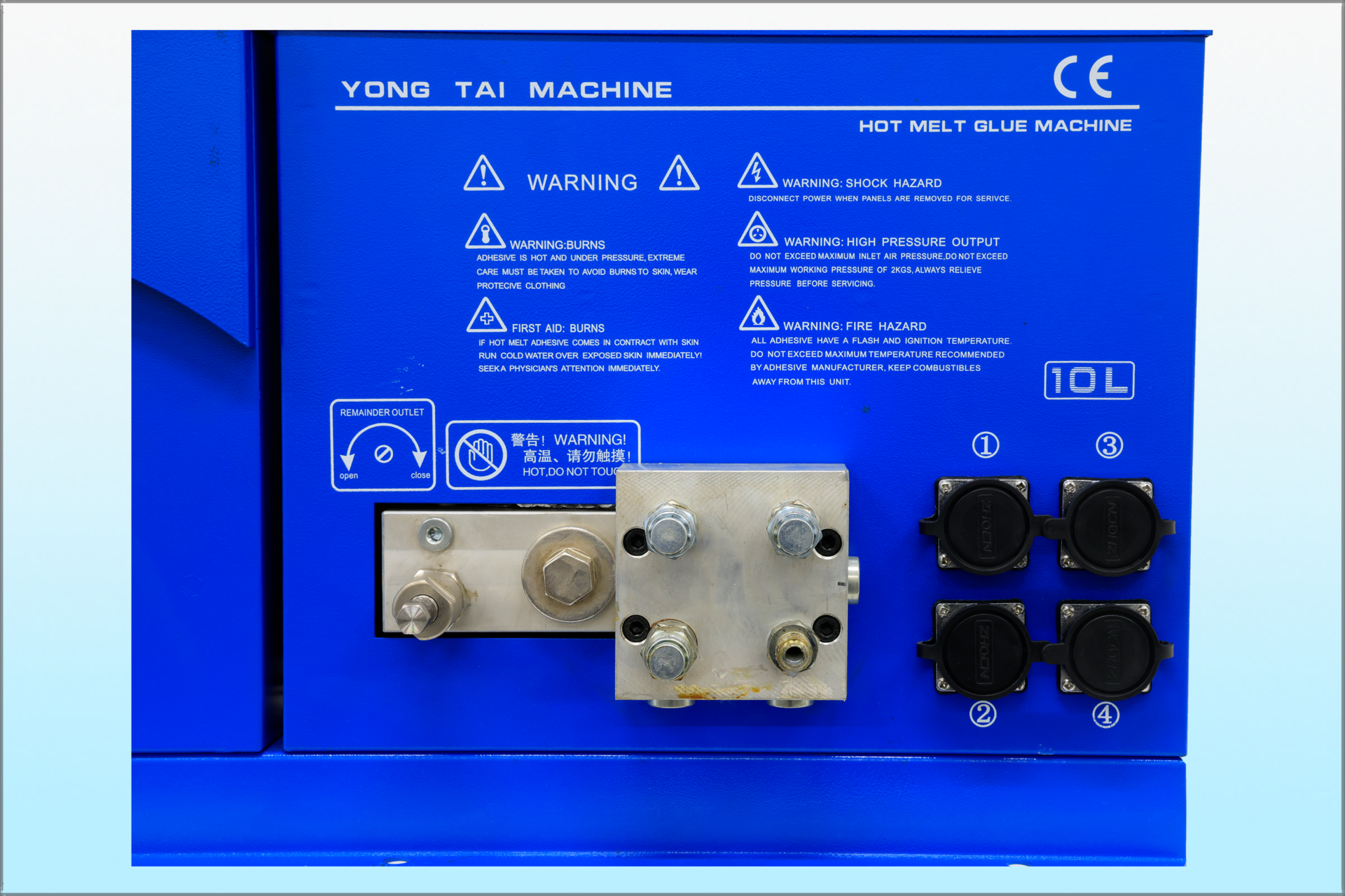 10Lホットメルトタンク(SY-LMQ10P4) 使用電源 単相200VAC ワット数 3,800W タンク容量 10L 最大溶解能力 15kg/hr 最大動作温度 200℃ 寸法 380H×720W×470H 重量 50㎏ 最大使用粘度 12,000cps ポンプタイプ ピストンポンプ ホース数 4本 ポンプレイト 10:1 -